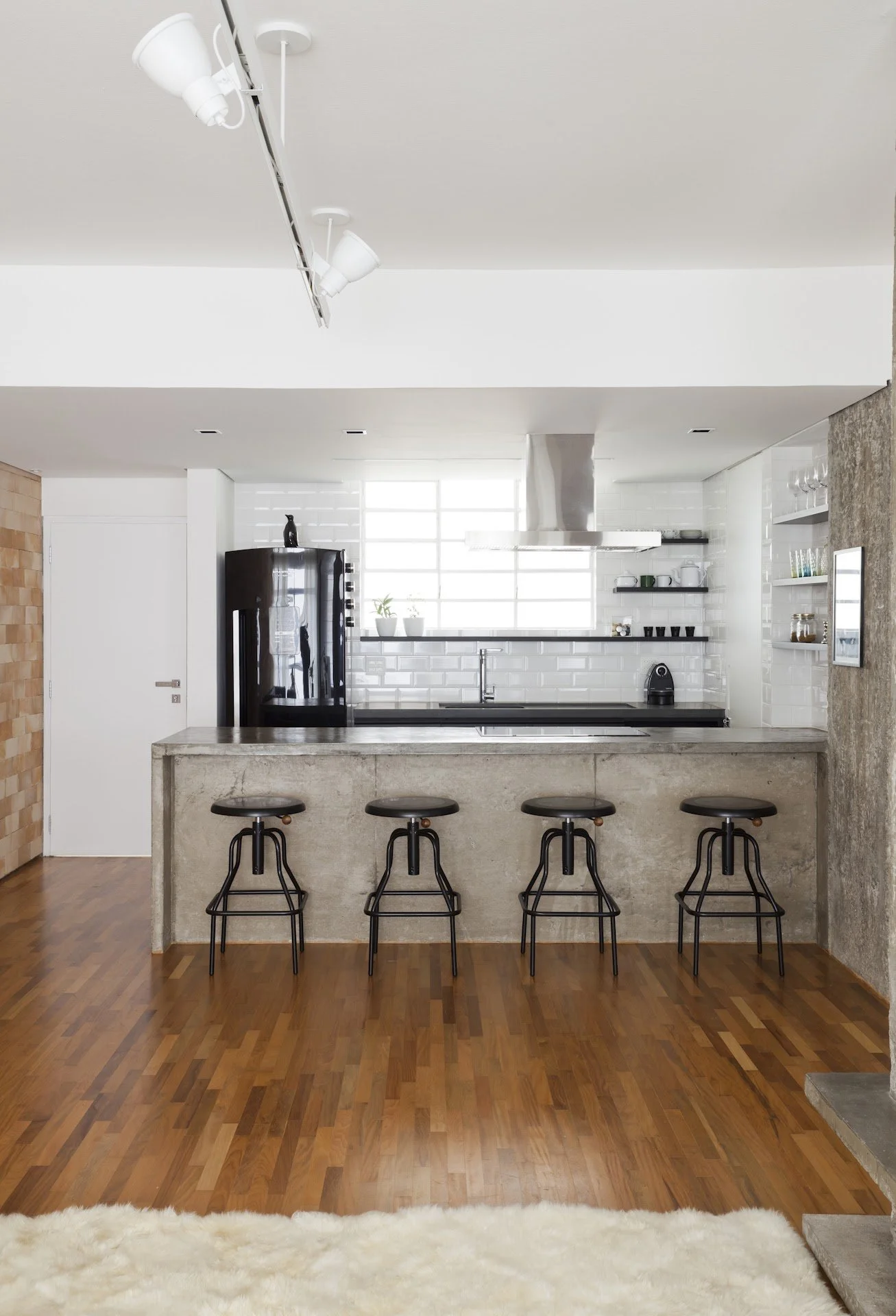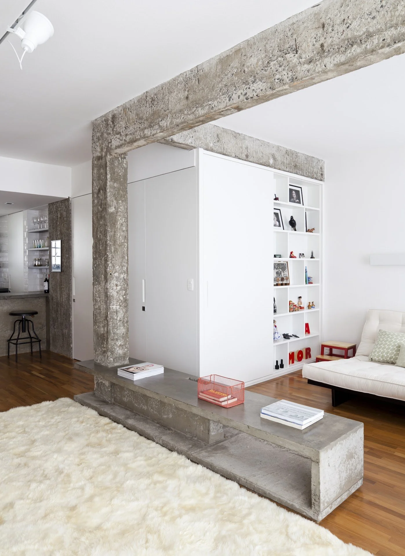 Este projeto de reforma é uma ode à autenticidade e à conexão entre os espaços internos e externos, trazendo à tona o charme do concreto aparente e o acolhimento dos ambientes verdes. Inspirado pela estética brutalista do edifício "Engenharia" de Victor Reif, de 1961, optamos por descascar colunas e pilares, revelando o concreto original e conferindo ao apartamento uma atmosfera industrial única. A estrutura, cuidadosamente preservada, foi "descolada" para criar uma moldura natural entre a sala de estar e o escritório, sem compartimentar os ambientes, garantindo fluidez e integração.