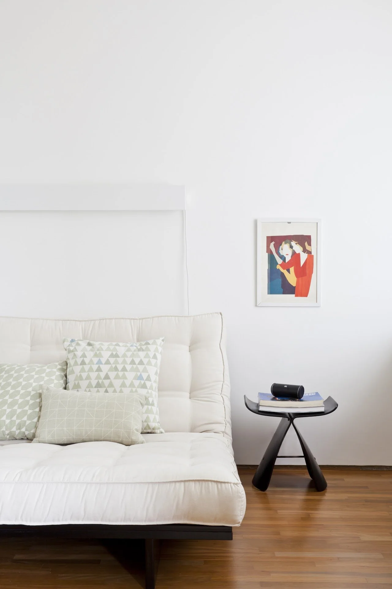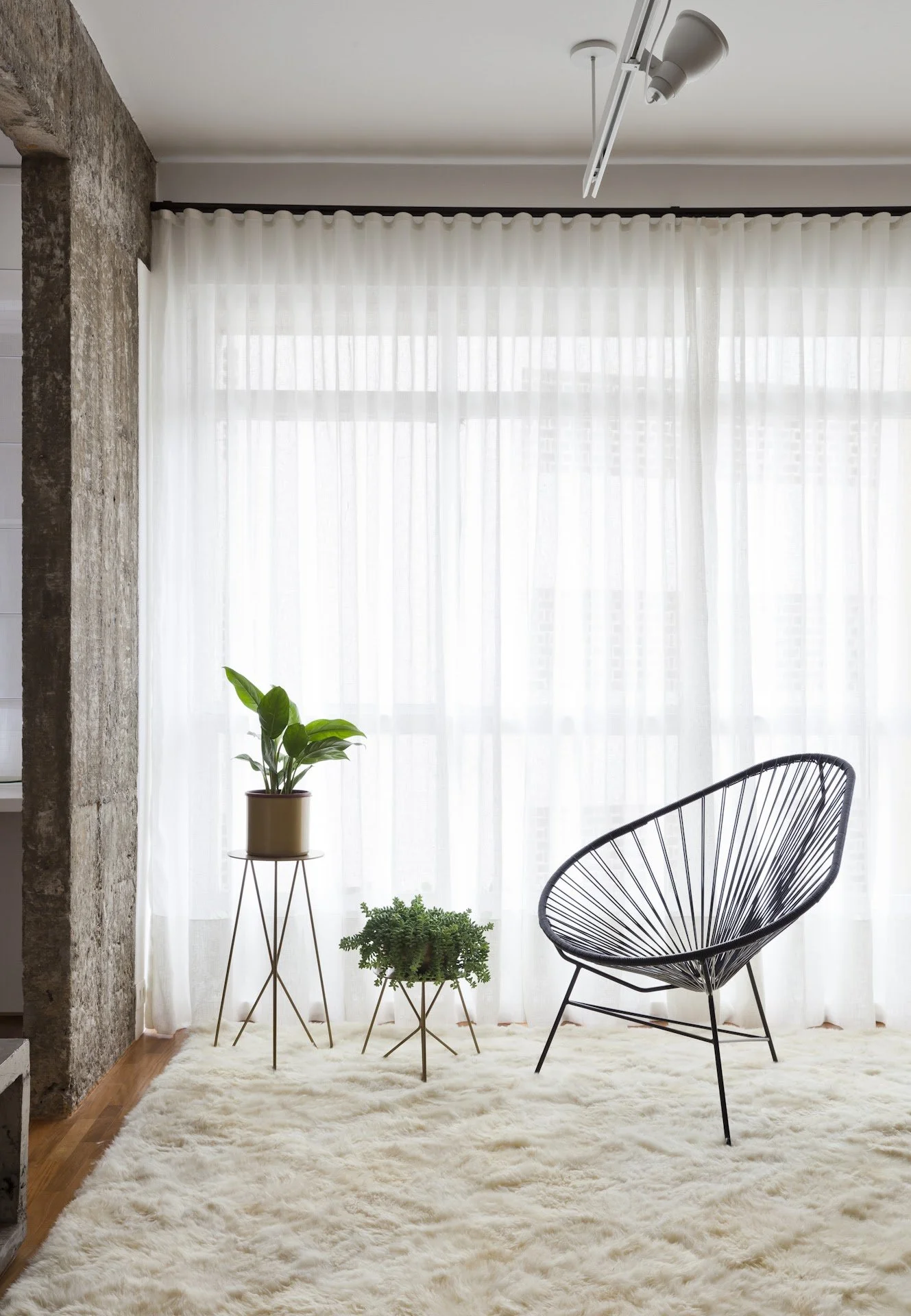 O projeto também reflete uma busca por conforto e nostalgia, como ilustrado pela presença da cadeira Acapulco, posicionada estrategicamente em frente à janela com vista para o jardim. Essa peça remete às varandas das casas de avós e às cidades do interior, onde a vida ao ar livre se funde com o interior da casa. Aqui, trazemos essa essência para o apartamento, resgatando a vitalidade do exterior por meio de móveis de jardim e pequenos espaços verdes.