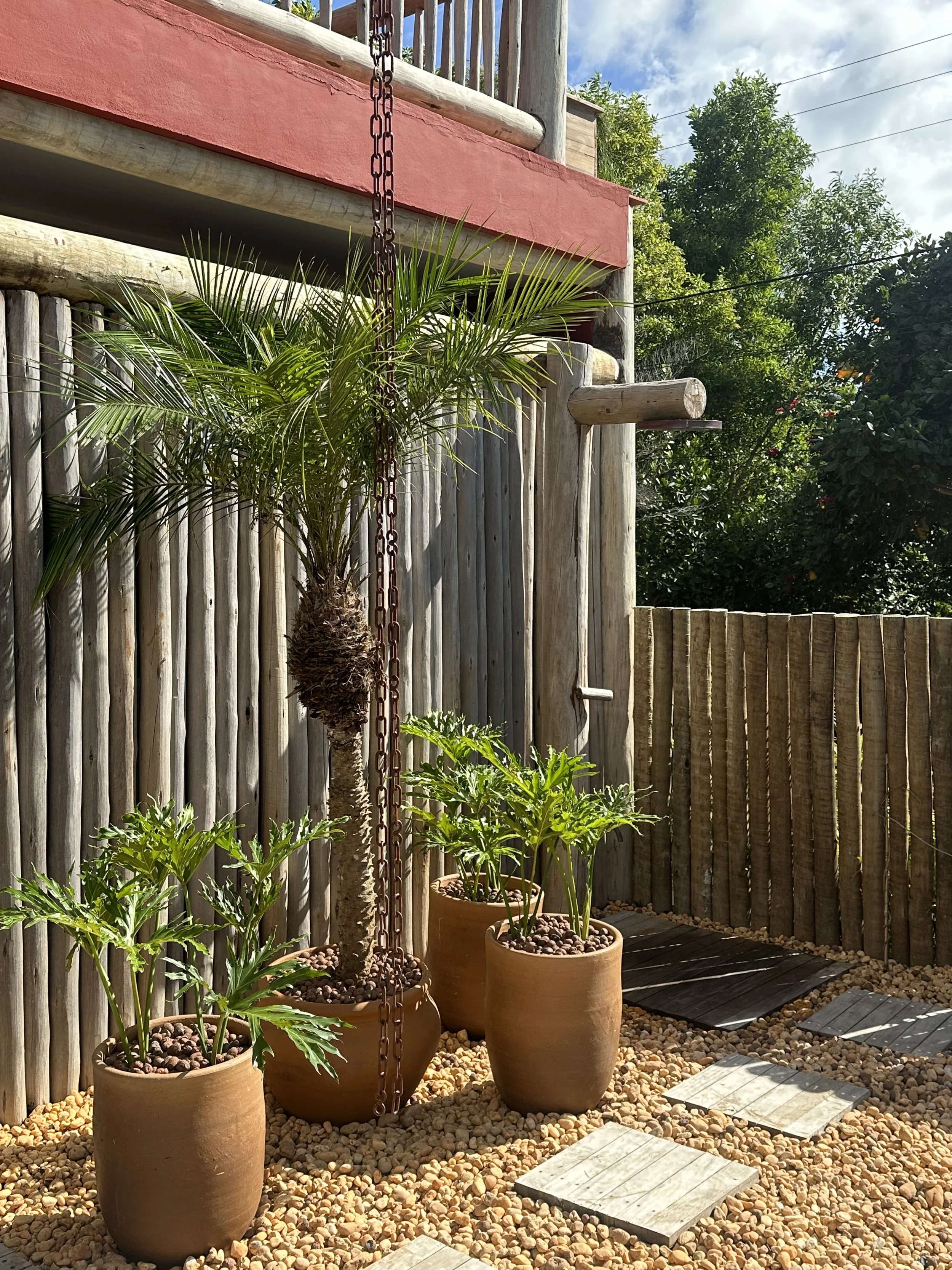 O paisagismo, cuidadosamente planejado por nós, evoca a exuberância da Mata Atlântica, trazendo a natureza para dentro da casa. A seleção de plantas nativas e a criação de um jardim com cara de “mata” contribuem para um ambiente mais fresco e agradável.