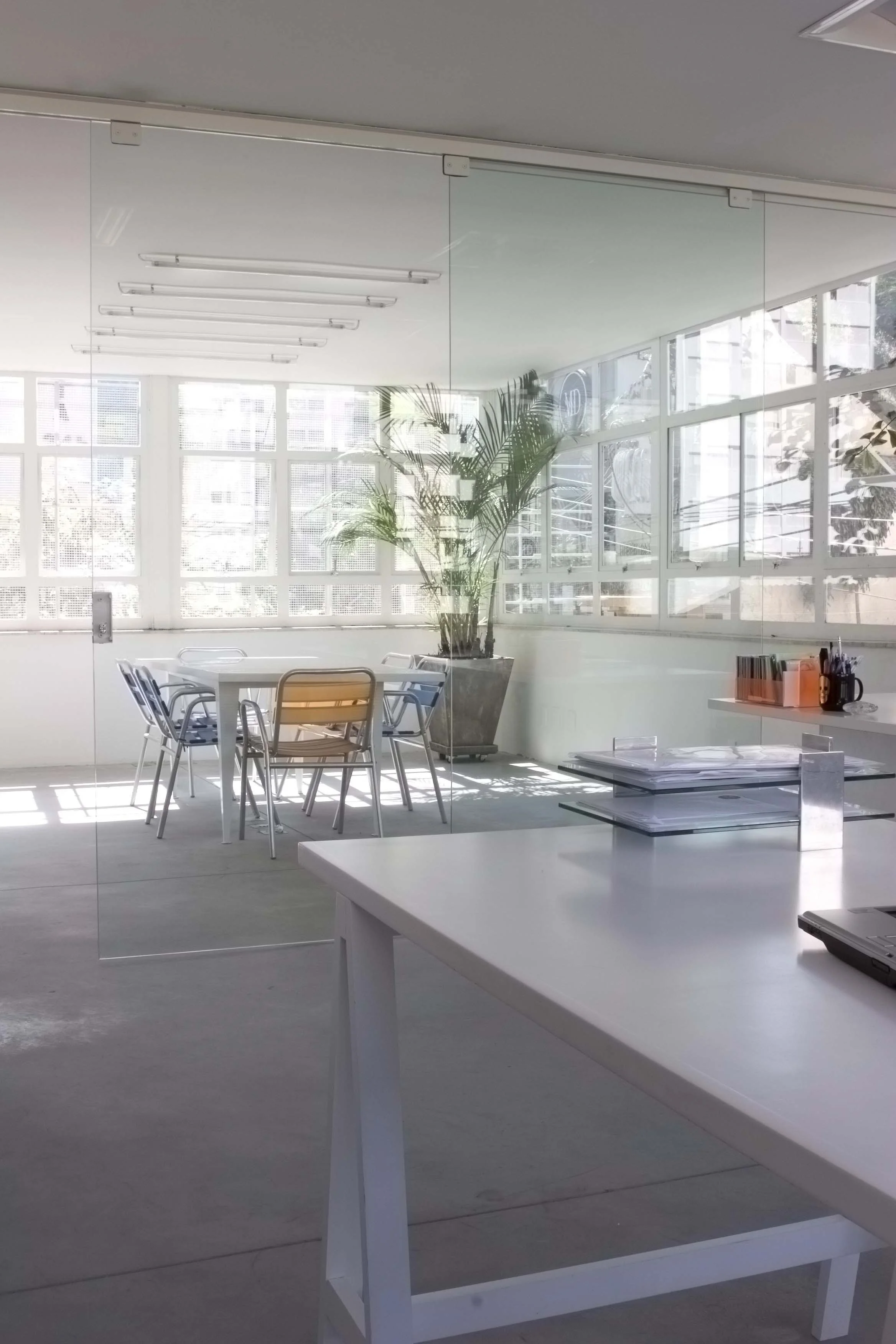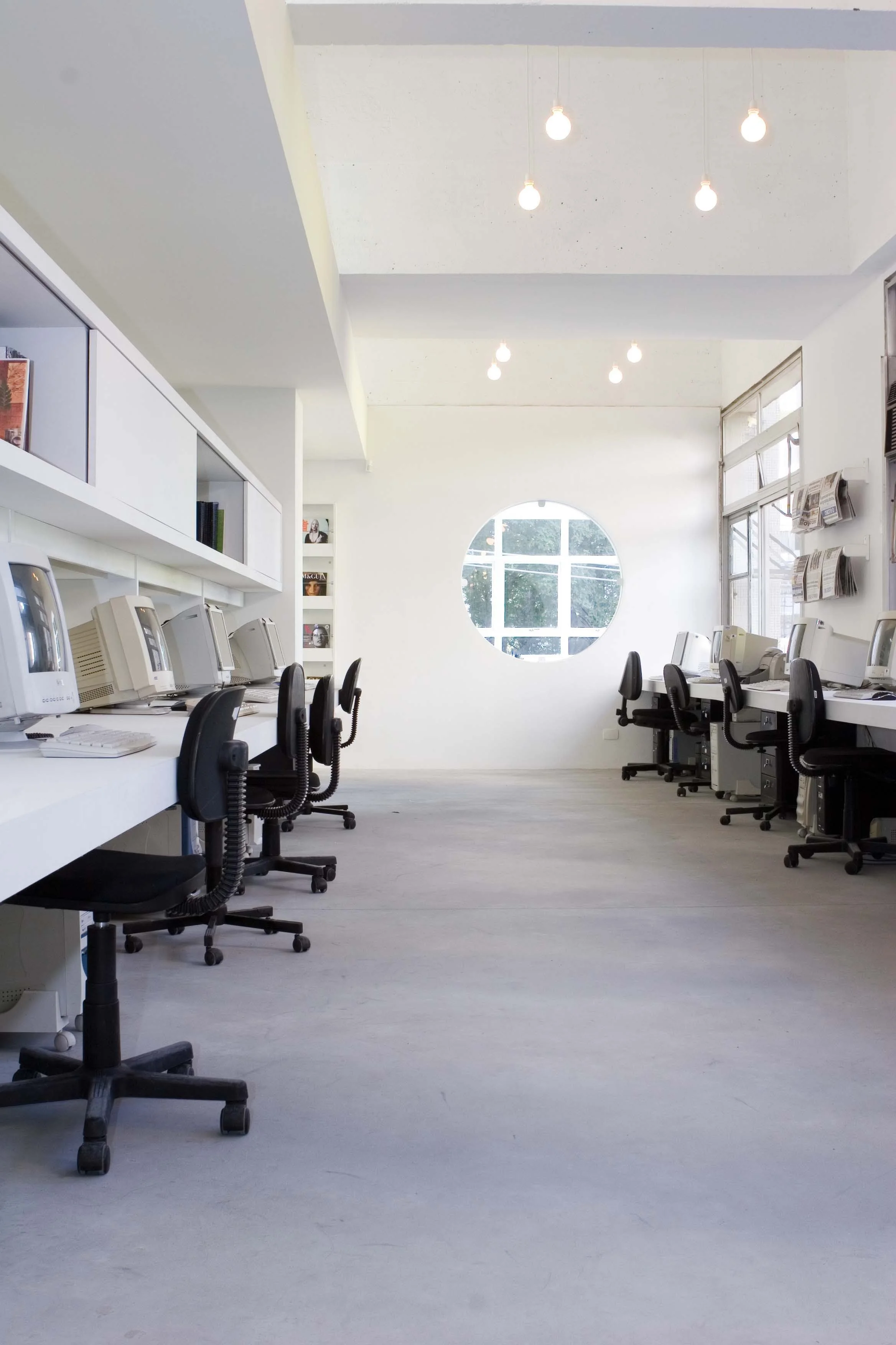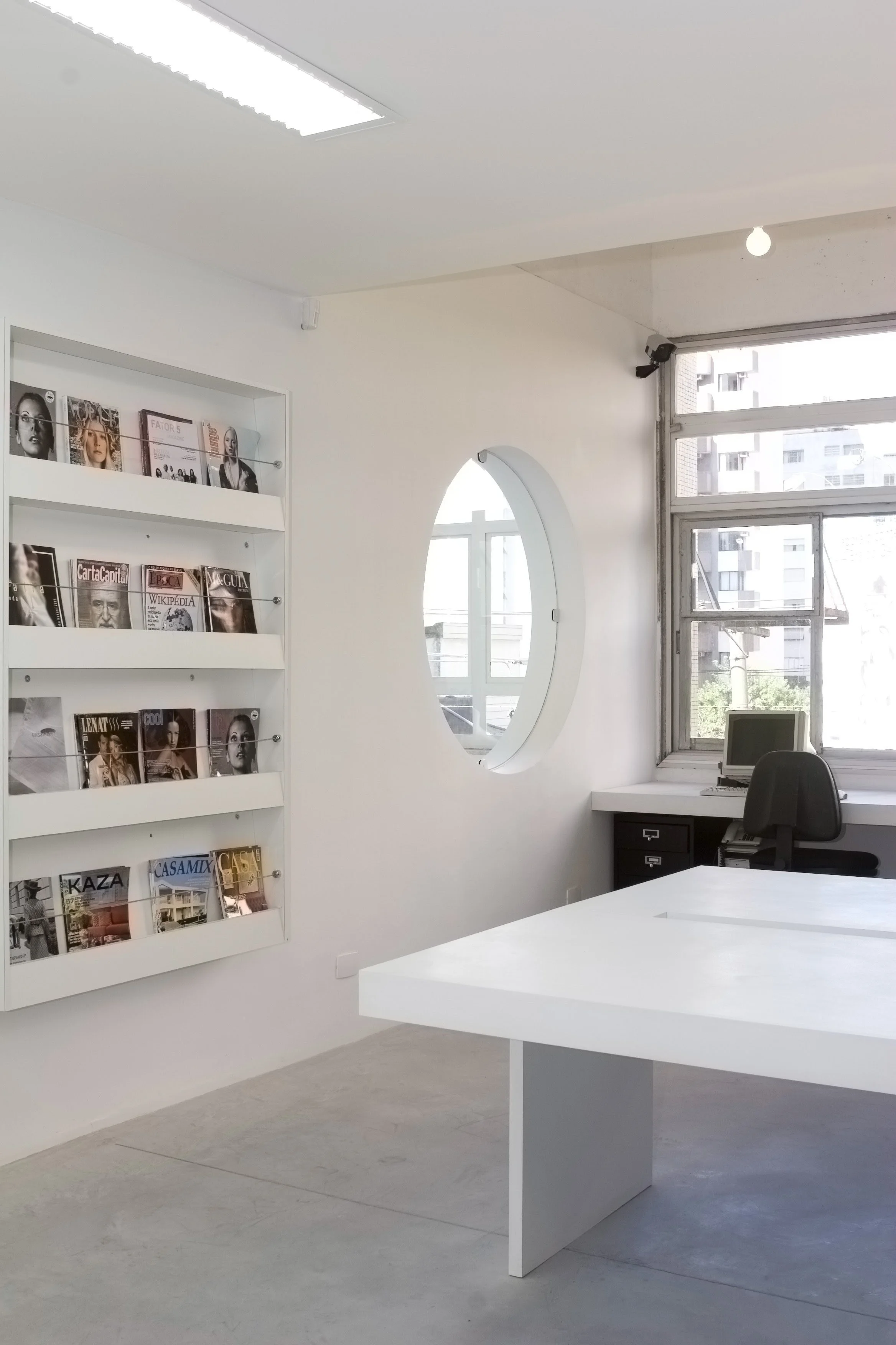 No escritório, o ambiente é projetado para favorecer a iluminação natural com janelas amplas e formas geométricas marcantes, como a abertura em círculo que adiciona identidade visual ao espaço. Mobiliário de linhas retas e estantes embutidas reforçam a simplicidade e funcionalidade, criando um espaço que equilibra perfeitamente as necessidades de trabalho com a estética moderna e sofisticada da agência.